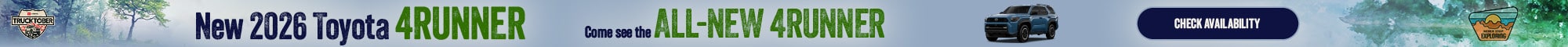 Disclaimer(s) : Qualified buyers can finance a new 2026 Tundra at 2.99% APR for 48 Months. APR: Qualified customers who finance a new 2026 Tundra can receive as low as 2.99% APR for 48 months with 48 monthly payments of $22.13 for every $1,000 financed. Terms available on approved credit through Toyota Financial Services (TFS) at participating Toyota dealers. For only very well qualified customers. Amount financed, down payment amount, and credit worthiness may impact availability of offer. Dealer contribution may vary and could affect price. Individual dealer prices, other terms and offers may vary. Must take retail delivery from dealer's stock and terms subject to vehicle availability. Cannot be combined with TFS Lease Cash, Down Payment Assistance, Trade-in Assistance, Customer Cash, Lease, Lease Subvention Cash. See your participating Toyota dealer for details. Dealer sets final price. Offer available in CA regardless of buyer's residency; void where prohibited. Expires 11-03-2025. Toyota Financial Services is a service mark used by Toyota Motor Credit Corporation (TMCC). Retail installment accounts may be owned by TMCC or its securitization affiliates and lease accounts may be owned by Toyota Lease Trust (TLT) or its securitization affiliates. TMCC is the servicer for accounts owned by TMCC, TLT, and their securitization affiliates.ToyotaCare covers normal factory scheduled maintenance for 2 years or 25,000 miles, whichever comes first, and 24/7 Roadside Assistance is for 2 years/unlimited mileage (note: ToyotaCare for Mirai is 3 years/35,000 miles and Roadside Assistance for Mirai, bZ4X, Prius, Prius Prime and Prius Plug-in Hybrid is 3 years/unlimited mileage). Roadside Assistance does not include parts and fluids, except limited emergency gas delivery. Towing distance up to 25 miles. Restrictions apply. Available in the continental U.S. and Canada. See Toyota dealer for details and exclusions. Truth in Lending Act Disclosure:
